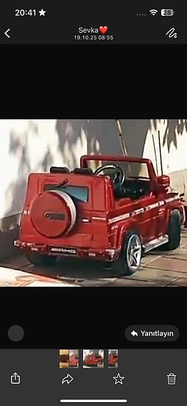 1) Uşaq elektrik maşını – kabriolet tipli, qırmızı rəng. Korpus yığcam “off-road” dizaynlıdır, ehtiyat təkər qapağı arxadadır, yanlarda dekorativ xətlər, alüminium üslubunda disklər. Salon: sükan, oturacaq və idarəetmə paneli. Kiçik uşaqlar üçün minik oyuncağı kimi uyğundur, həyətdə və hamar səthlərdə gəzinti üçün nəzərdə tutulub.