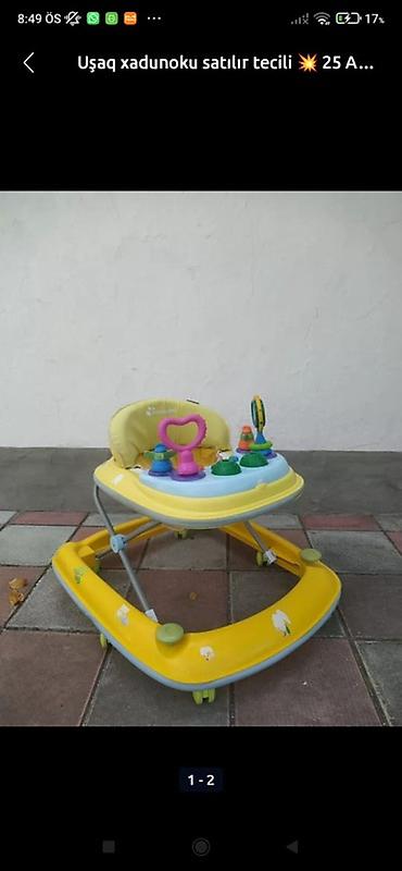 3) Uşaq xadunoku – sarı-açıq mavi rəng çalarları. Tənzimlənən oturacaq dəstəyi, yumşaq arxa, əyləncəli oyuncaqlarla panel, çevik hərəkət üçün çoxsaylı təkərlər və dayanıqlı metal çərçivə. Uşağın ilk addımlarında balans və hərəkət koordinasiyasını dəstəkləmək üçün nəzərdə tutulub.