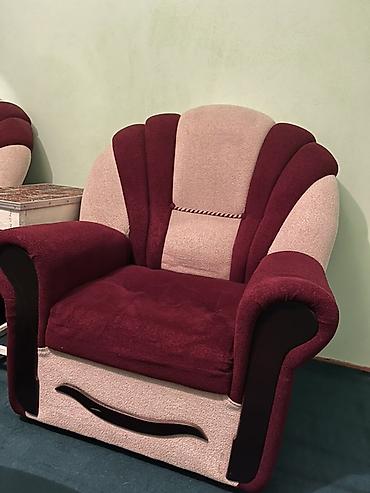 2) Kreslo – ikirəngli (tünd bordo və açıq bej) yumşaq parça üzlüklü. Geniş oturacaq və qalın bel hissəsi, dalğalı dekor panellər, qolluqlar və ön hissədə qara dekor elementləri. Qonaq otağı və istirahət guşəsi üçün rahat oturma mebeli.