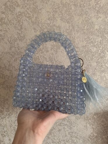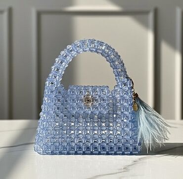 Şəffaf muncuqlardan əl ilə toxunmuş çanta - Material: parlaq, işıqda rənglərə çalan şəffaf akril muncuqlar - Dizayn: üst hissədə saplı miniatür “top-handle”, ön hissədə qızılı rəngli incə zəncir v...