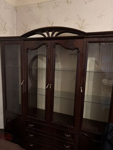 • Şüşəli vitrin/dolab: 4 qapılı (orta hissə şüşəli), içəridə şüşə rəflər; aşağıda 3 geniş çekmece.