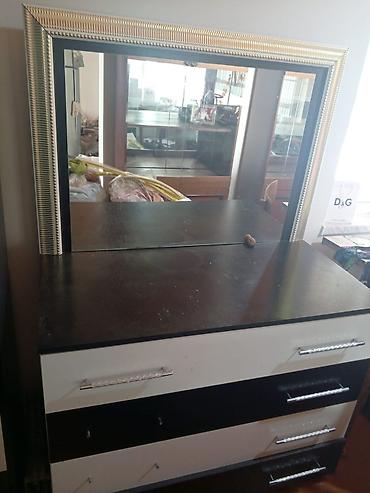 - Tualet masası güzgü ilə: üstündə böyük çərçivəli güzgü, aşağıda 4 geniş çekmece; eyni iki rəngli üslubda.