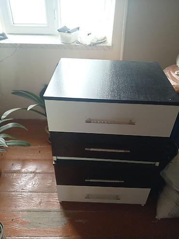 - Kiçik komod: 3 çekmecəli, yığcam ölçü, üstü qara, fasadları qara–ağ; metal tutacaqlar.