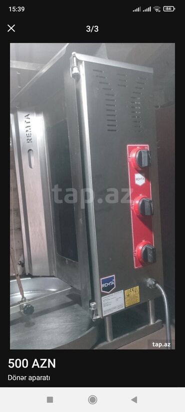 Hasanoğlu firmasına məxsus 3 gözlü, motorlu dönər aparatı – 2 ədəd. - Hər biri: 400 AZN - 3 faza qoşulma - Cəmi 1 ay istifadə olunub - Tam ideal vəziyyətdə - Ünvan: Bakı, Şirin x. Xüsusiyyətlər: -...