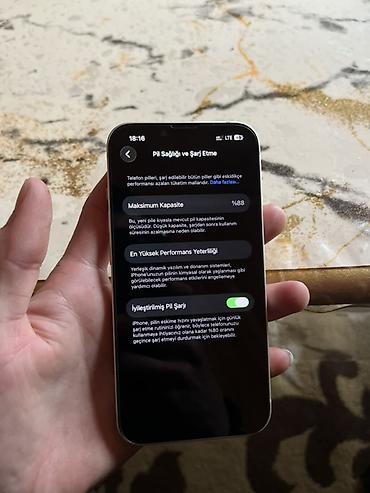 - Batareya: “Pil Sağlığı və Şarj Etmə” bölməsində maksimum tutum 88%, “İyiləşdirilmiş Pil Şarjı” aktiv
