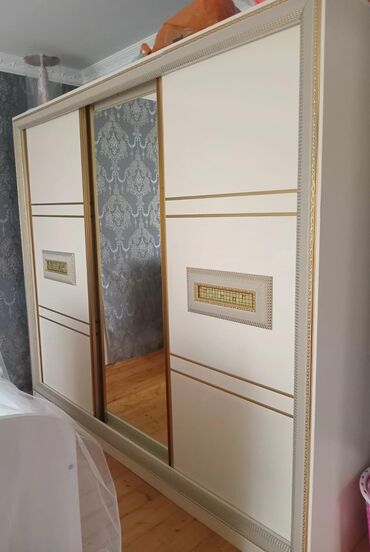 - Sürgülü qapılı iri şkaf: orta qapı güzgülü, daxili bölmələr və asılqan üçün nəzərdə tutulmuş geniş sahə; fasadda qızılı panellər.