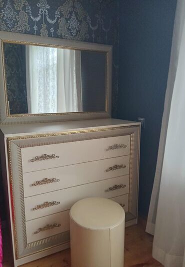 - Komod-güzgü: 4 geniş çekmece, üstündə iri çərçivəli güzgü. Çərçivələr qızılı haşiyəlidir.