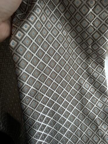 - Naxışlı pərdələr – bej-qəhvəyi fonda rombvari xırda naxışlar, mavi nöqtə aksentləri; klassik interyerlərlə uyumlu.