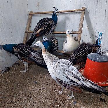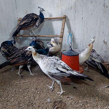 - Şəkillərdə göstərilən qrup tavus quşları satılır: mavı-yaşıl boyunlu klassik rəngli quşlar və açıq-krem/boz tonlarında nadir rəngli fərdlər.