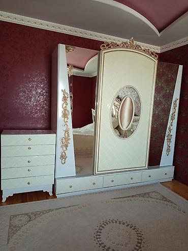 - 1 ədəd paltar şkafı – sürüşkən qapılar, iri oval güzgü, alt hissədə 3 çekmece, fasadda qızılı ornamentlər