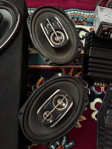 Komplektdə gördükləriniz: iki ədəd Pioneer 6x9 koaksial dinamik (TS-A6998S). Şəkillərdə montaj üçün xalça örtüklü lövhə və digər akustik komponentlər də yer alır.