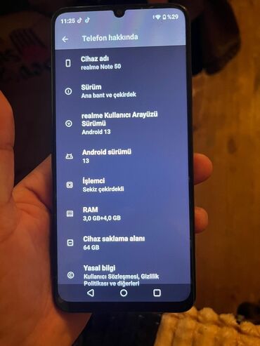 - Ekranlarda cihaz haqqında bölmə görüntüləri mövcuddur (Android 13, 8 nüvə, 3+4 GB RAM, 64 GB yaddaş)