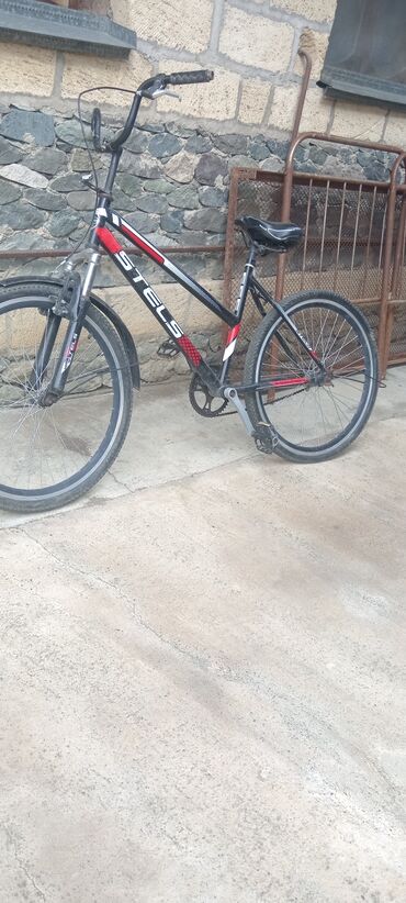 Stels şəhər/dağ tipli velosiped - Marka/model: STELS - Çərçivə: yüngül metaldan, klassik trapezoid forma, qara-qırmızı-ağ rənglər - Asqı: ön amortizatorlu çəngəl (STELS logosu) - Təkərlər: 26" (tə...