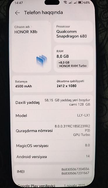 HONOR X8b smartfon - Sistem: MagicOS 8 - Prosessor: Qualcomm Snapdragon 680 - RAM: 8 GB + HONOR RAM Turbo (əlavə 8 GB) - Daxili yaddaş: 128 GB (təxminən 79.73 GB boş yer göstərilir) - Ekran: 2412 ...