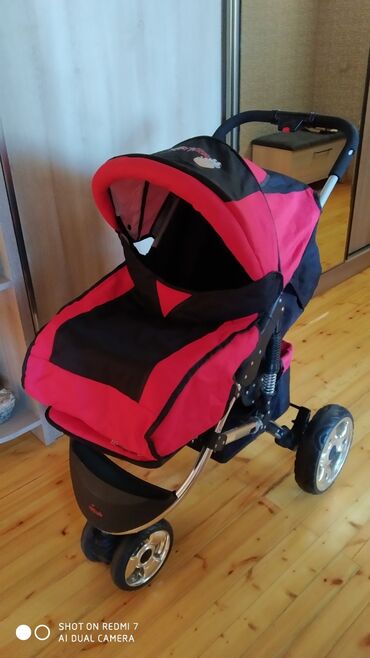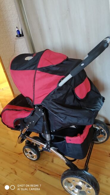 Qırmızı reng uşaq kolyaskası + Ana qucağı (maşın üçün oturacaq). Geniş