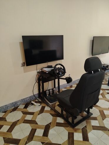 Sim racing üçün tam quruluş: ekrana qarşı sükan-pedal stendi və ayrıca konsol+divanlı zona. Yarış oyunları, arxadaşlarla multiplayer və əyləncə məkanı yaratmaq üçün əlverişlidir.