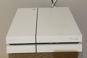 Sony PlayStation 4 (ağ rəng, orijinal korpus). Ön paneldə 2 USB portu mövcuddur. Şəkillərdə görünən kimi iki ədəd qırmızı/qaranlıq DualShock 4 simsiz oyun pulti ilə birlikdə. Konsol standart PS4 modelidir, üst paneldə Sony və PS4 loqoları, ön hissədə USB-lər və disk yuvası yerləşir. TV-yə HDMI vasitəsilə qoşulur, DualShock 4 pultlarında toxunma paneli, daxili akkumulyator, vibrofeedback və qulaqcıq çıxışı mövcuddur. İki pult sayəsində kooperativ oyunlar üçün uyğundur. Kabel görüntüdə var. Konsol masaüstü istifadə üçün yığıcam ölçüdədir və PS4 oyun kataloqunu dəstəkləyir, media tətbiqləri və onlayn funksiyalarla işləyir.