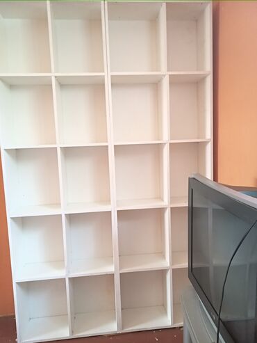 Ağ rəngli çoxbölməli divar rəfi - Material: laminat/MDF tipli ağ örtüklü taxta - Dizayn: açıq tip, müxtəlif ölçülü çoxsaylı bölmələr; yuxarı hissədə iri otaqlar, orta hissədə kitab və sənədlər üçü...