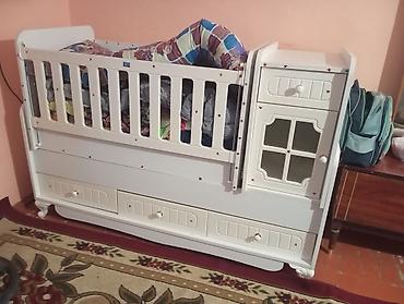 - Bələk/uşaq çarpayısı kombinə olunmuş model: yanları qoruyucu barmaqlıqlıdır, sürüşən mexanizmlə açılıb-bağlanır. Aşağıda iki iri çekmece. Sağ tərəfində üstü masa kimi istifadə oluna bilən komod hissəsi yerləşir: bir çekmece və qapılı bölmə.