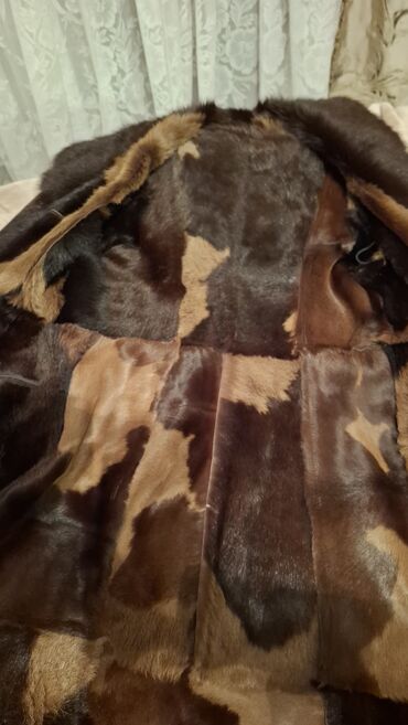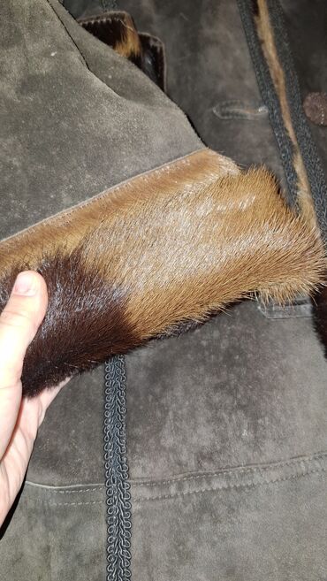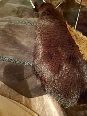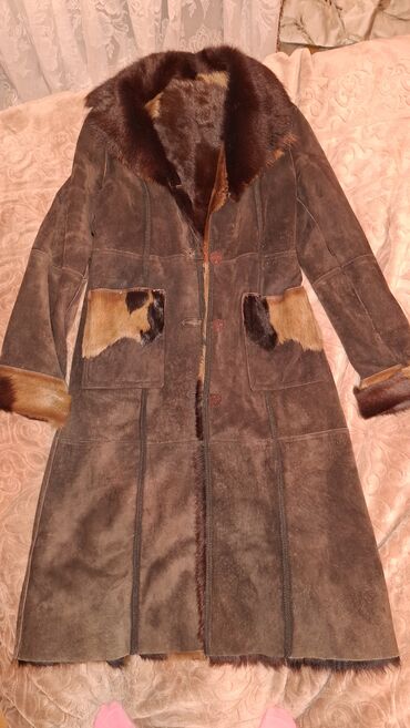 Qadın kürkü – uzun “shearling” tipli palto - Material: Təbii süet (xarici) və iç hissəsi qalın, yumşaq təbii yunla astarlanmış. - Rəng: isti qəhvəyi/boz-qəhvəyi tonlar. - Yaxa: iri, həcmli təbii x...
