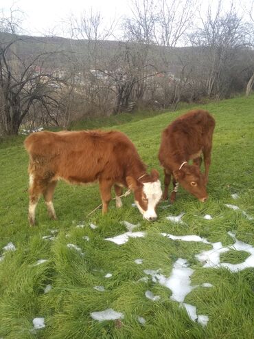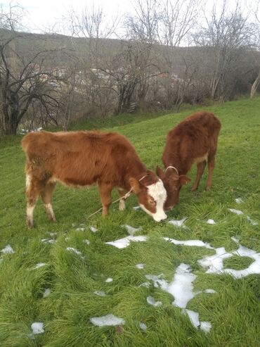 Satılır: 2 baş buzov - Növ: yerli cins (birinin rəngi qara-ağ, digərinin rəngi qəhvəyi) - Say: 2 baş - Yaş: təxminən buzov yaşında, boyları bərabərdir - Yemləmə: quru otla saxlanılır, tövlədədir -...