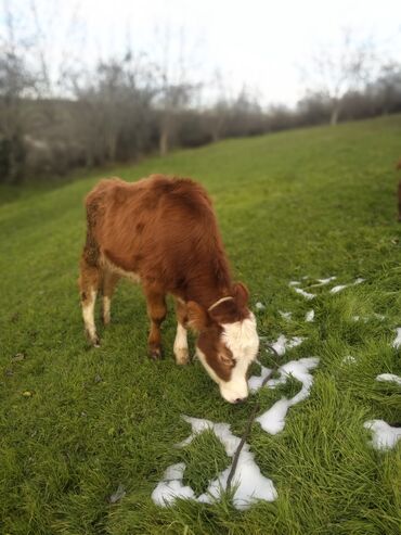 Satış üçün buzov - Növ: Qara mal (buzov) - Tük örtüyü: qalın, qıvırcıq, açıq qəhvəyi-krem rəng çalarları - Qulaqlar kiçik, başı qırmızımtıl tonlarda - Açıq otlaqda saxlanılır, geniş otlaq rejiminə...