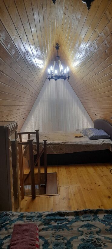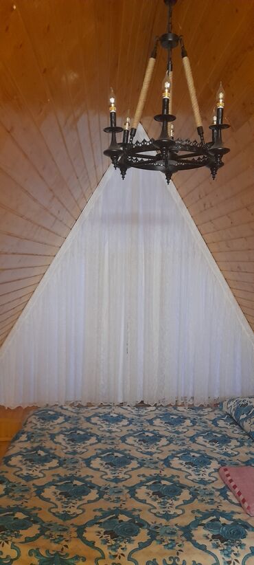 - Yuxarı mərtəbədə yataq zonası: iri iki nəfərlik çarpayı, krujevalı pərdələr, klassik avize