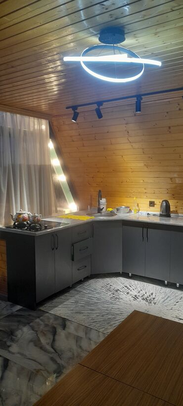 - Mətbəx: L formalı modul mebel, mərmər effekti stolüstü, qaz plitəsi (2 göz), davlumbaz, qabyuyan/lavabo, elektrik çaydanı, işçi səthlər və çekmecələr