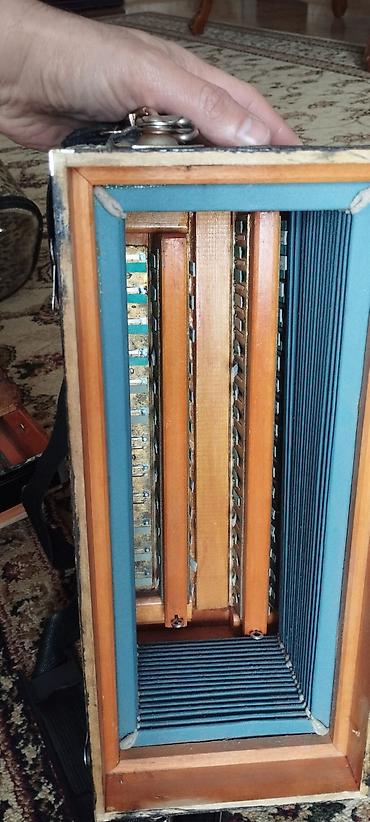 Təsvir: - Düyməli və klavişli kombinasiyalı akkordeon (sol tərəfdə pianino klavişləri, sağ tərəfdə düymələr) - Qara korpus, dekorativ naxışlı səslik panelləri - Qırmızı-bağırsaqlı məxmər rəngli məx...