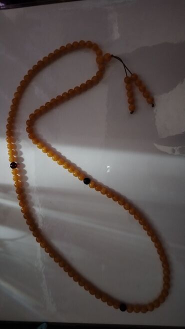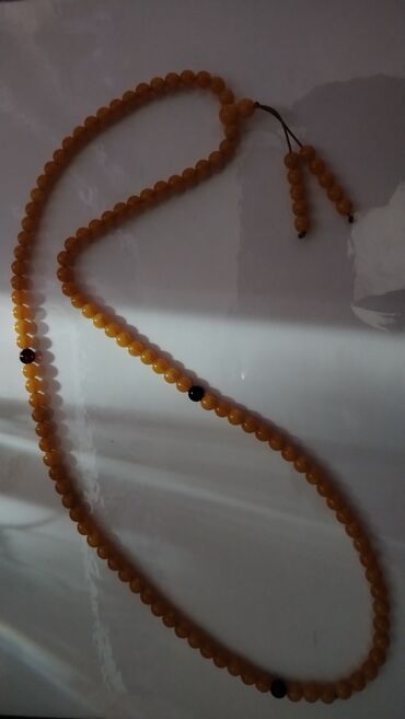 - Material: Bal rəngli muncuqlar (yuvarlaq, eyni ölçülü), arada 3 ədəd daha tünd rəngli vurğu muncuq