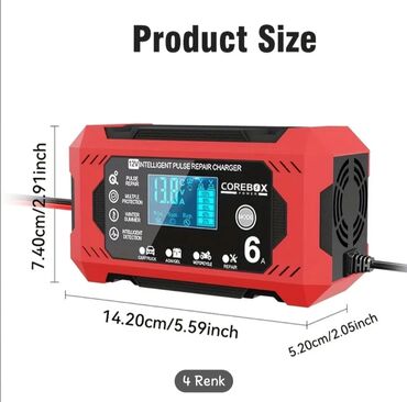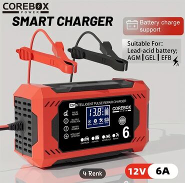 COREBOX Power 12V Intelligent Pulse Repair Charger – 6A - 12V akkumulyatorlar üçün ağıllı şarj cihazı - 2Ah–100Ah tutumlu batareyalara uyğundur - Avto, yük maşını, motosiklet, AGM/GEL batareyaları...