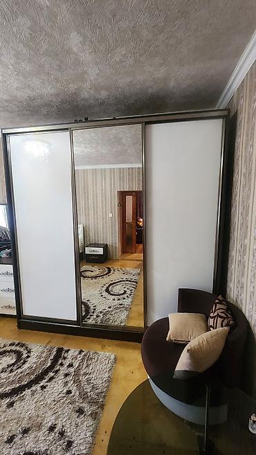 - Paltar şkafı: sürgülü qapılar, orta hissədə böyük güzgü, ağ-panelli önlər, tünd karkas.