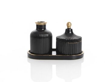Zərif dekorativ dəst – klassik üslubda Tərkibi: - 2 ədəd hündür şamdan/kompozisiya qabı - 1 ədəd qapaqlı dekorativ qab - 1 ədəd ovala yaxın meyvə/dessert vazası Xüsusiyyətlər: - Rəng: parlaq qara...