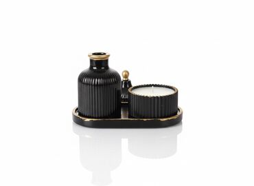 - Ünsiyyətli kompozisiya: şüşə və qab tray üzərində yan‑yana yerləşir