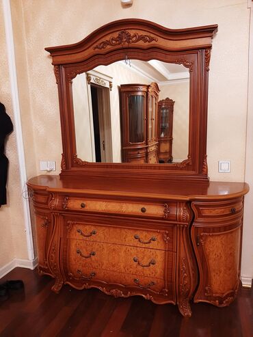 - Geniş bufet/komod güzgü ilə – üstün dekorativ oyma, mərkəzdə iri güzgü, aşağıda çoxsaylı çekmecələr və yanlarda qapalı bölmələr.