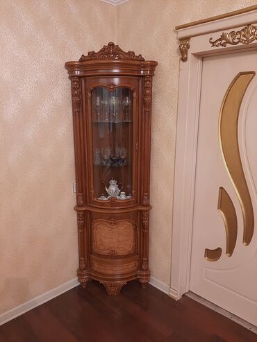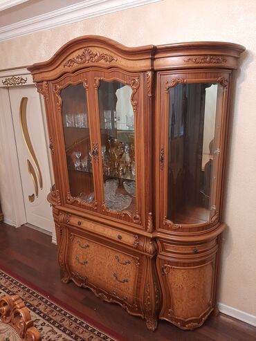 - Şüşə qapılı vitrin şkaf – mərkəzi bölmədə rəflər, yanlarda yarımdairəvi vitrin hissələri, aşağıda çekmecələr; qab-qacaq və dekor üçün ideal.