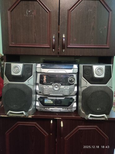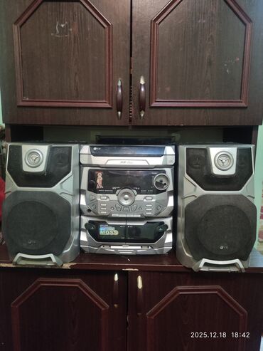 LG ev audiosistemi – 3 bloklu mini hi‑fi mərkəz və 2 akustik kolonkadan ibarət komplekt.
