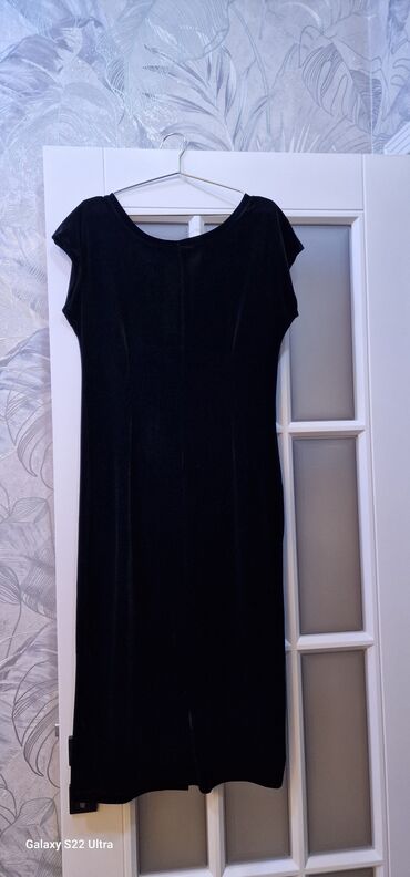 Sharuel Firma Qadın paltarı razmer (40) zərif məxmər və həcimli qol dizaynı - Model: uzun, bədənə oturan siluet, dizdən aşağı uzunluq - Material: əsas hissə qara məxmər; qollar parıltılı, toxumalı...