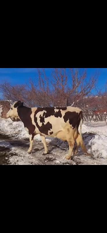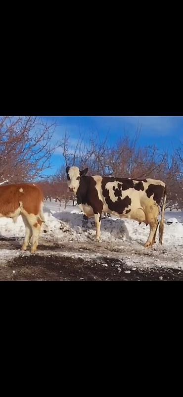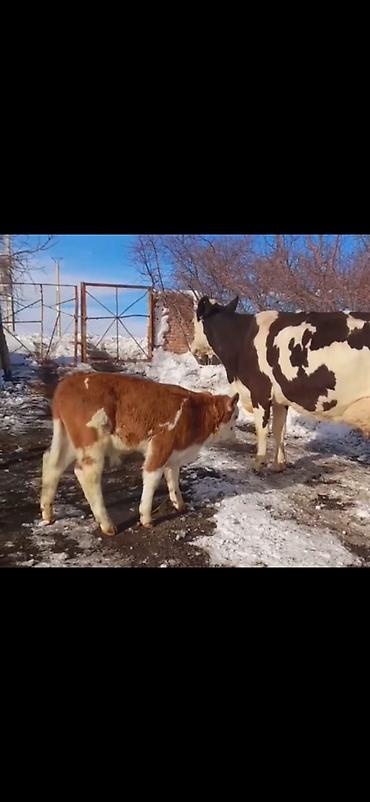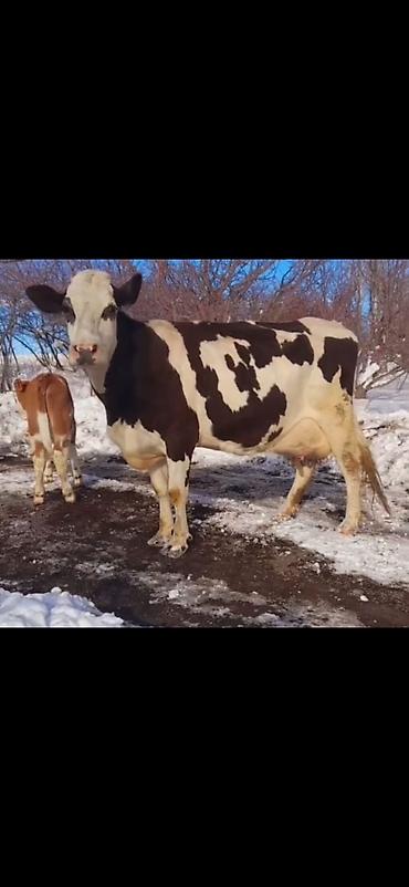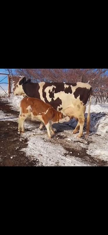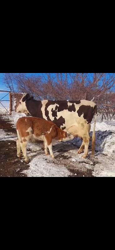 - Cins tipajı: qaradonuz/holşteyn qarışıq görünüşlü südlük inək, yanında qırmızı-ağ rəngli sağlam buzov.