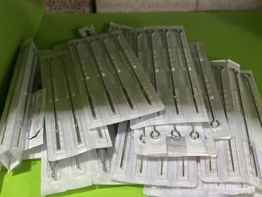 - Steril, ayrı-ayrı paketlənmiş iynələr – müxtəlif konfiqurasiyalar (xətt və şading), EO-sterilizasiya nişanı olan blister qablaşdırmada.
