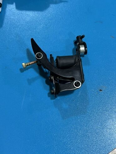 - Bobin tipli tatu maşını – xətt və kölgə işləri üçün tənzimlənə bilən vint, güc kabeli girişi, sap üçün mötərizə. Tutacaqda mavi elastik sarğı və iynə ucluğu quraşdırılıb.