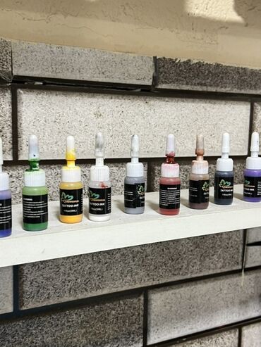 - Rəngli tatu mürəkkəbləri – bir neçə ton: bənövşəyi, yaşıl, sarı, ağ, boz, qırmızı, çəhrayı, qəhvəyi və s. Kiçik butulkalar, damcı ucluqları ilə.