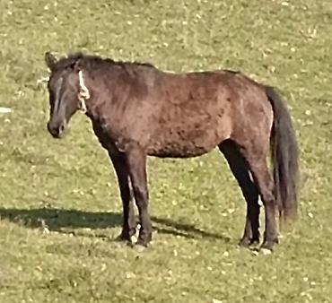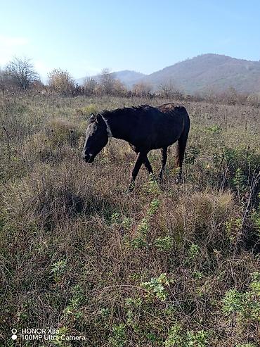 Dağ və çöl işləri üçün minik/yük atı - Rəng: qara - Tam yəhər-lişnə və yedək kəndiri ilə birlikdə - Başlıq (ağızlıq), yəhər altlığı, yəhər üstü örtüklər və qoşqu qayışları üzərindədir - Sakit xasi...