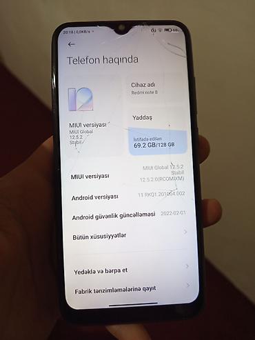 Xiaomi Redmi Note 12 – 8 GB RAM, 128 GB yaddaş Texniki xüsusiyyətlər: - Model: Xiaomi Redmi Note 12 (MIUI 12 göstərilir) - Yaddaş: 128 GB daxili, 8 GB RAM (ekrandakı “Telefon haqqında” bölməsinə ə...