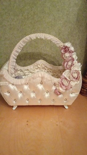 Xonça səbəti – zərif nikah/nişan aksessuarı - Material: krem/ağ atlas parça üzlü, kənarları incə krujeva və muncuq bəzəkləri - Forması: dairəvi əsas, möhkəm dairəvi qulplu - Bəzəklər: atlas lentlə...