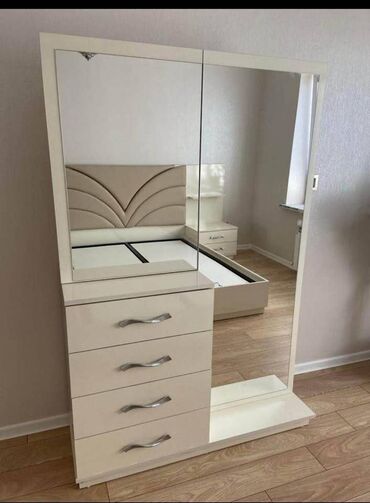 В городе Кусар, в прекрасном состоянии, мало использовалась, мебель для гостевой спальни. Гардероб вместительный, фурнитура удобная, двери купе с зеркалами в полный рост, имеется подсветка от батареек. Комод с двумя зеркалами: малым и в полный рост. За маленьким зеркалом имеется потайное место для хранения. Комод с выдвижными ящиками, очень вместительными. Кровать тоже подсвечивается от сети. По бокам тумбы, соединенные с кроватью. Тумбы имеют по два вместительных ящика, под полками обоих тумб тоже имеется тактильная подсветка.