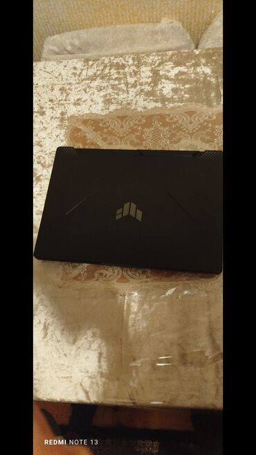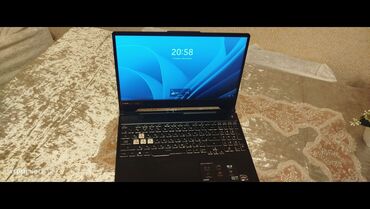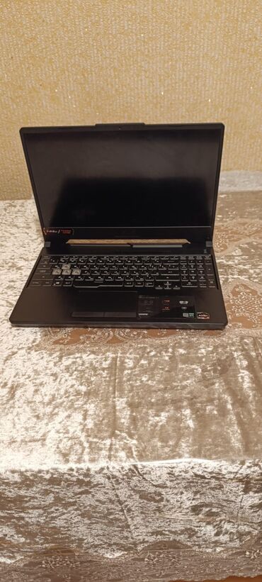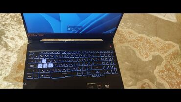 Oyun, qrafika işləri və gündəlik istifadə üçün uyğun güclü oyun noutbuku. Ekranda Windows interfeysi göstərilir. Dizayn mat qara, küncləri idman üslublu, TUF brend nişanları ilə.