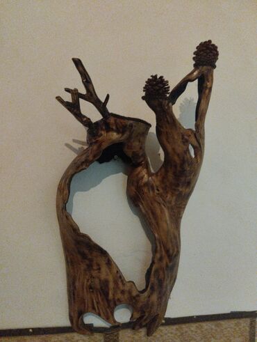 - Təbii ağacdan hazırlanmış dekorativ divar kompozisiyası. Tək parça kök/gövdə forması qorunaraq oyma işləmələr edilib, üst hissədə çam qozaları və budaqvari elementlər var. Divara asmaq üçün arxa hissədə montaj yeri mövcuddur. Rustik və ekoloji stilə uyğun, giriş, qonaq otağı və ya kənd evləri üçün ideal vurğu detalı.