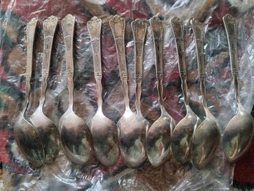 - Klassik üslubda metal çay qaşıqları dəsti – 10 ədəd. Sap hissələrində ornamentli relyef naxışlar, vintage dizayn. Masa-servis, kolleksiya və fotoçəkilişlər üçün dekor kimi uyğundur.
