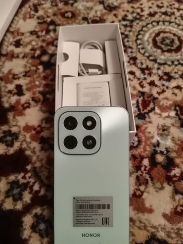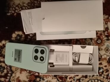 HONOR smartfon – açıq yaşıl rəngdə, kvadrat modulda üçlü arxa kamera dizaynı. Qutusu və aksesuarları ilə birlikdə.